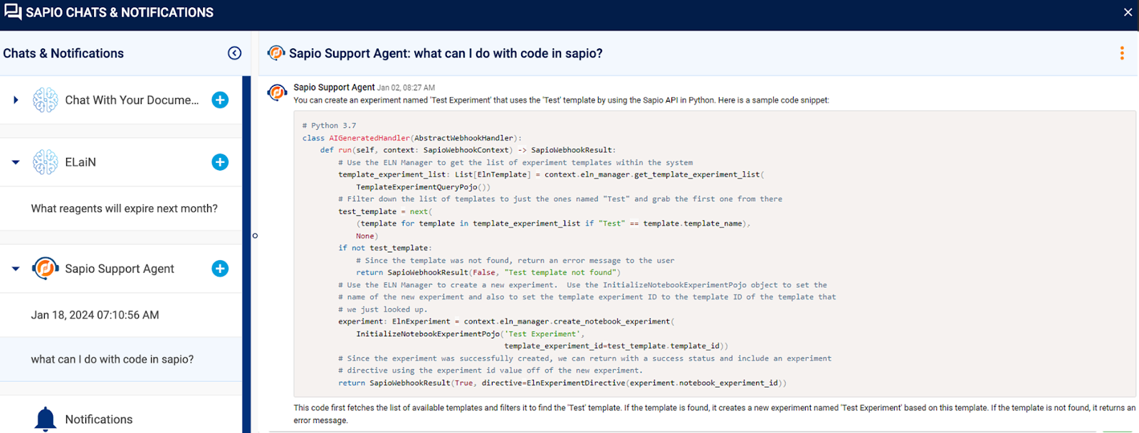 For example, you can ask ELaiN a question like “How can I create an experiment called ‘Test Experiment’ that is based on the ‘Test’ Template in Python code?” and from this, you’ll get ready to use Python code: