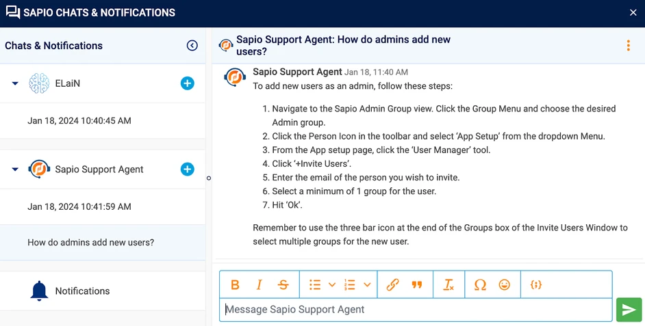 As well as helping you more quickly set up experiments, ELaiN can answer any questions you’ve got about using Sapio Scientific Data Cloud SDMS, Sapio ELN, or Sapio LIMS. Via the Sapio Support Agent, which is part of ELaiN, you simply ask your support query as a natural language question, and ELaiN does the rest. For example, if you ask, “How do admins add users?”, you’d get a response like this from ELaiN: